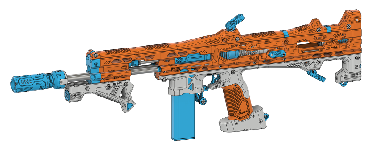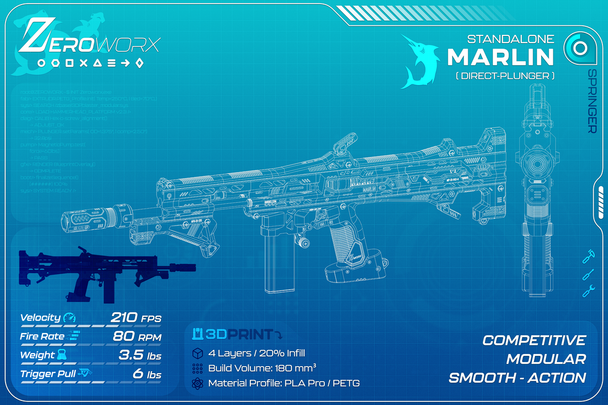 The Marlin is a direct-plunger blaster built with the same catch architecture used in the Hammerhead platform, retaining full compatibility with the magnetic pump system. It functions similarly to traditional direct-plunger blasters such as the Caliburn or Talon Claw but features an offset barrel layout to remain fully compatible with the Zeroworx attachment ecosystem. A full-metal catch provides durability for high-performance tuning and repeated use.