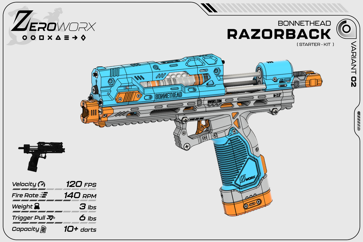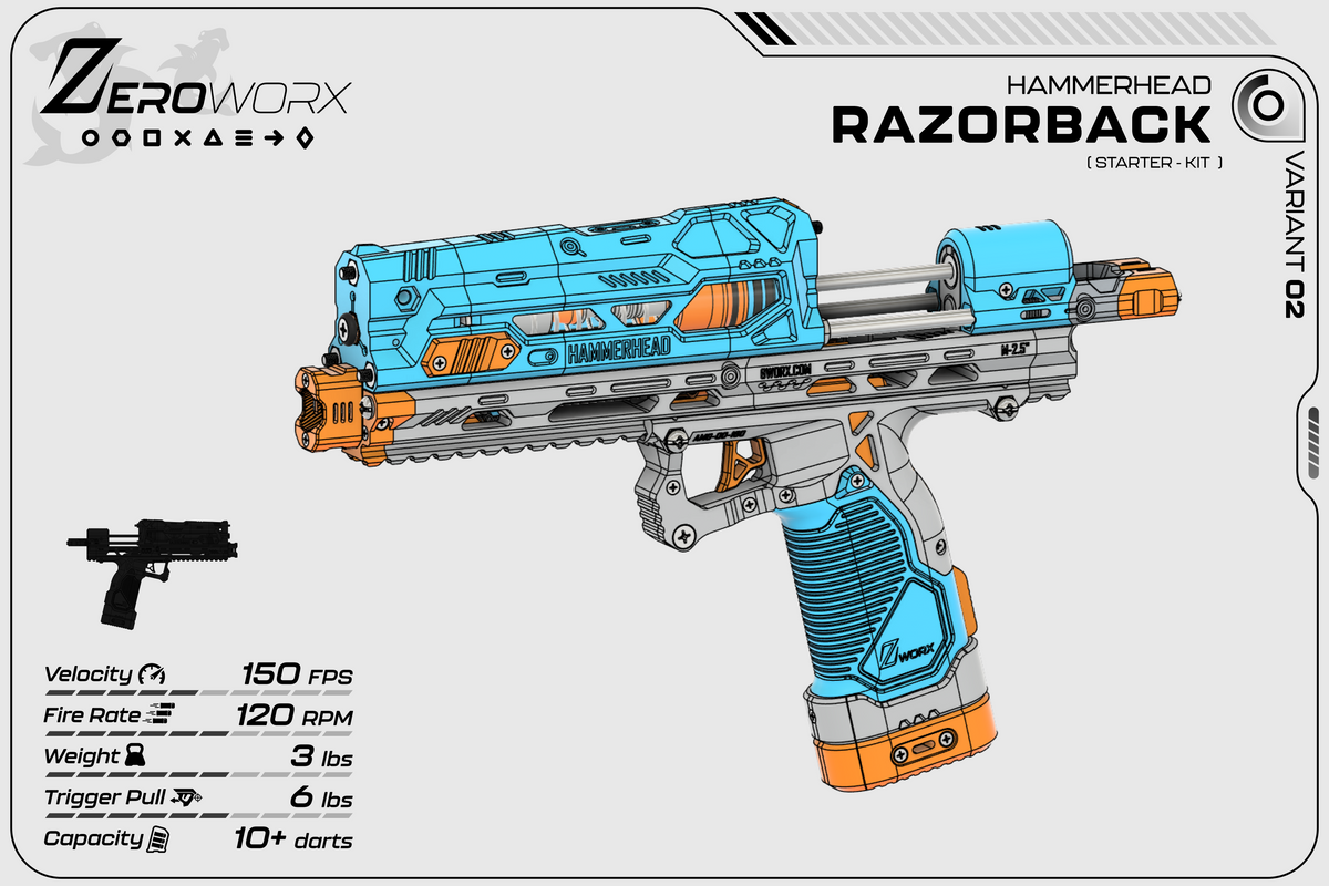 The Scalloped Hammerhead is a one off demo version built as an approachable blaster for new users. It keeps the strength and serviceability you expect from Hammerhead engineering while stripping weight and complexity so getting started is fast and fun.