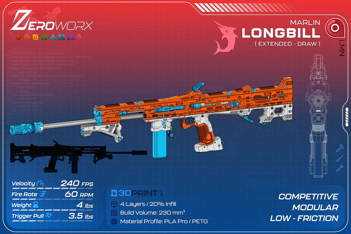 The Longbill Add-On increases the Marlin’s draw length by 1", providing greater plunger volume and higher output while retaining the direct-plunger layout and full-metal catch system. It is designed for users who want additional performance without altering the platform's core structure or attachment compatibility.