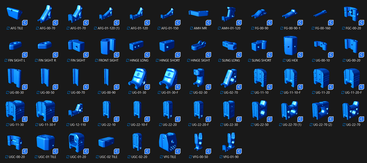 This is a 56-piece modular forward grip system based on the UniGrip standard. More than a dozen grip styles are included, all interchangeable across three universal grip interfaces labeled 0, 1, and 2. Connector pieces let you bridge interfaces and build outward like modular bricks, so you can iterate quickly and mix form with function.